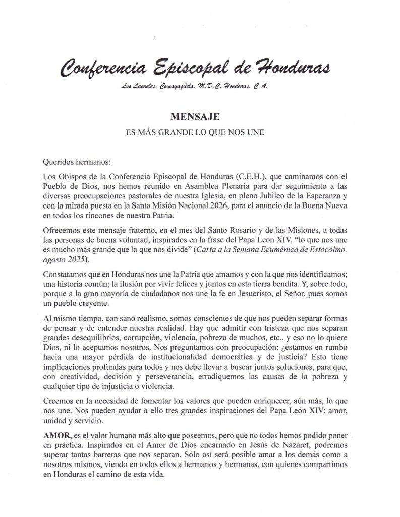 Los Obispos de la Conferencia Episcopal de Honduras (C.E.H.), que caminamos con el Pueblo de Dios, nos hemos reunido en Asamblea Plenaria para dar seguimiento a las diversas preocupaciones pastorales de nuestra Iglesia, en pleno Jubileo de la Esperanza y con la mirada puesta en la Santa Misión Nacional 2026, para el anuncio de la Buena Nueva en todos los rincones de nuestra Patria.