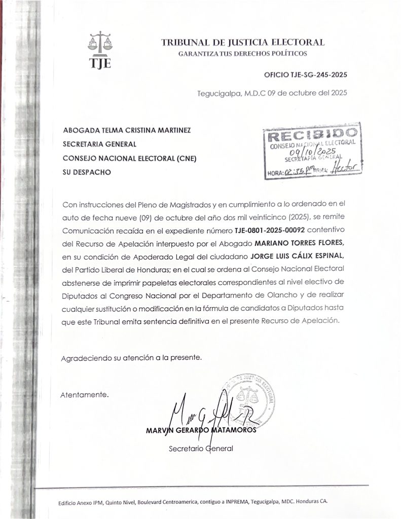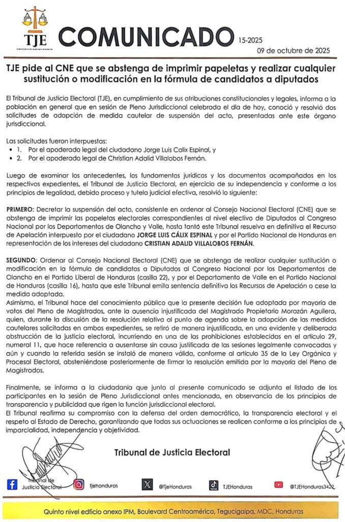 El Tribunal de Justicia Electoral (TJE) solicitó este jueves al Consejo Nacional Electoral abstenerse a imprimir papeletas electorales o modificar la fórmula de candidatos a diputados.