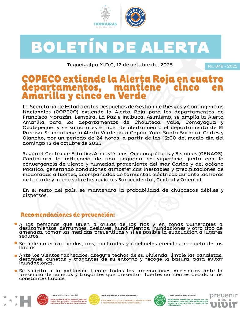 La Secretaría de Gestión de Riesgos y Contingencias Nacionales (COPECO) extendió este domingo la alerta roja para los departamentos de Francisco Morazán, Lempira, La Paz e Intibucá.
