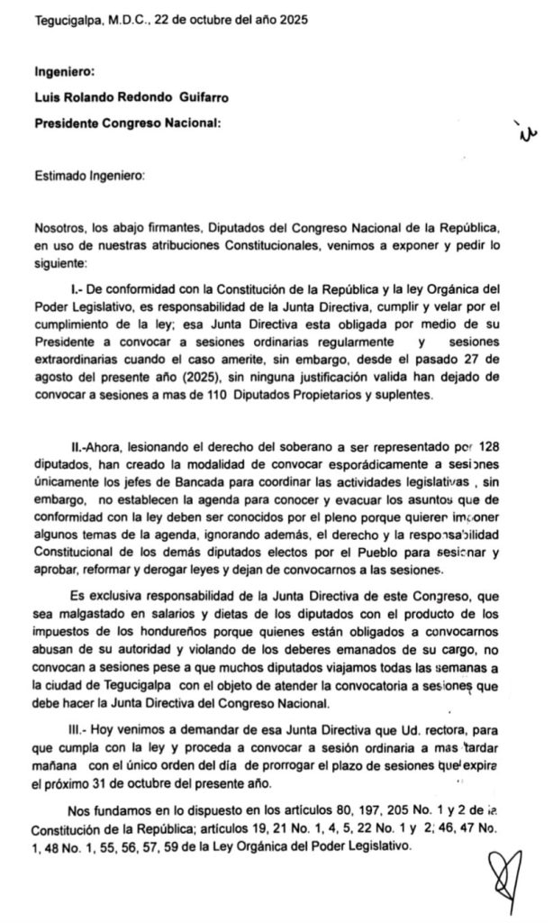 Diputados del Partido Liberal solicitaron este miércoles al presidente del Congreso Nacional, Luis Redondo, cumplir con la ley y convocar a sesión ordinar «a más tardar mañana con el único orden del día de prorrogar el plazo de sesiones que expira el próximo 31 de octubre».