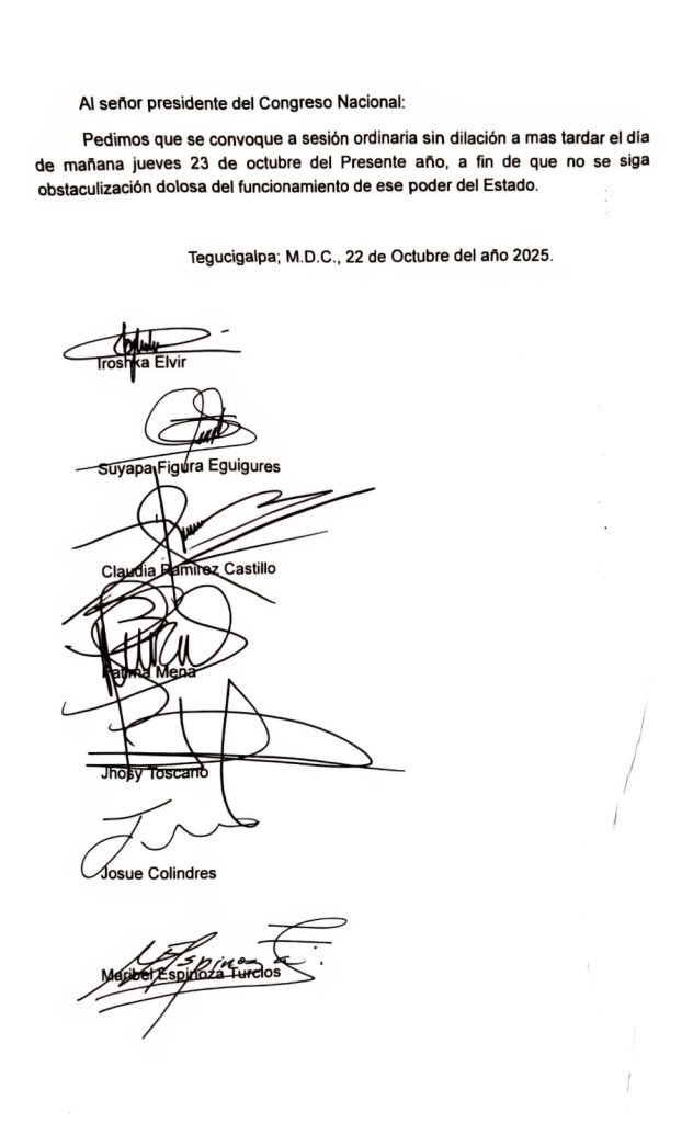«Pedimos que se convoque a sesión ordinaria sin dilación a más tardar mañana jueves 23 de octubre, a fin de que no se siga obstaculización dolosa del funcionamiento de ese poder del Estado (Legislativo) «, cita la carta enviada al titular del Congreso Nacional.
