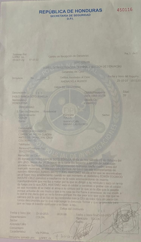 Según la denuncia, Soto se dirigía a su casa de habitación y se bajó de su vehículo junto a dos de sus asistentes, pero el ciudadano Edwin Edgardo Matute comenzó a insultarle de la nada y le amenazó a muerte.