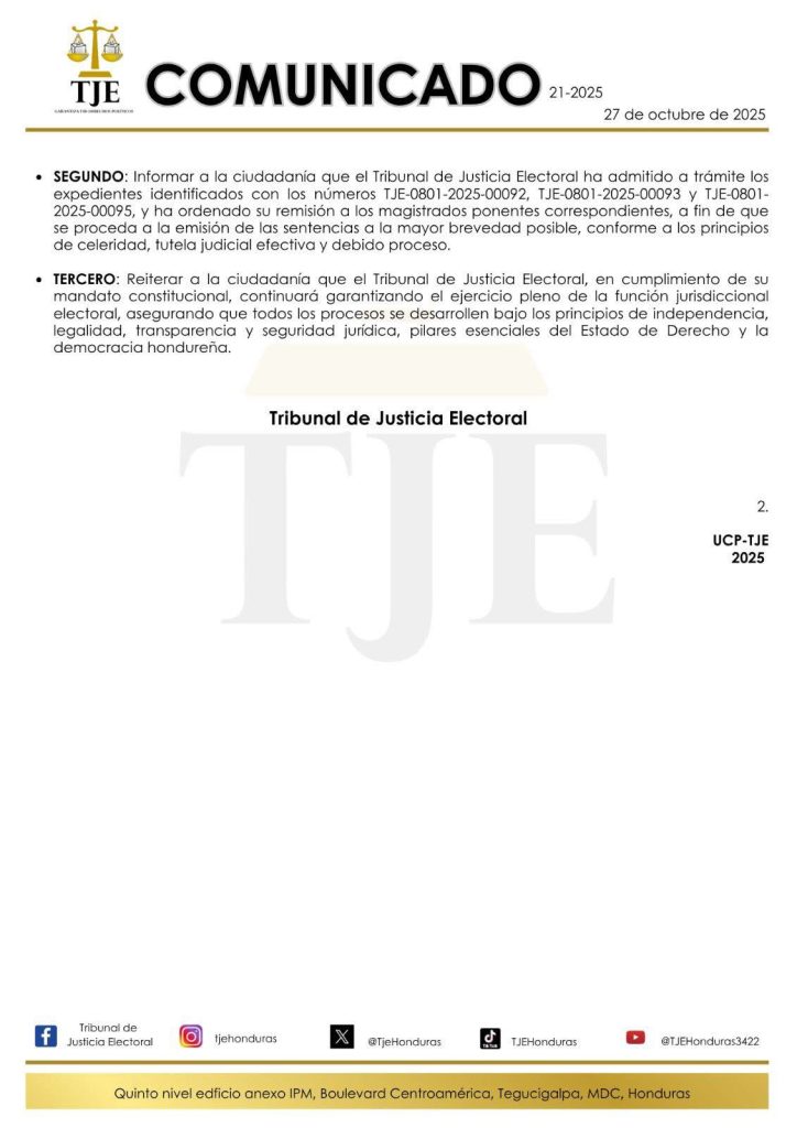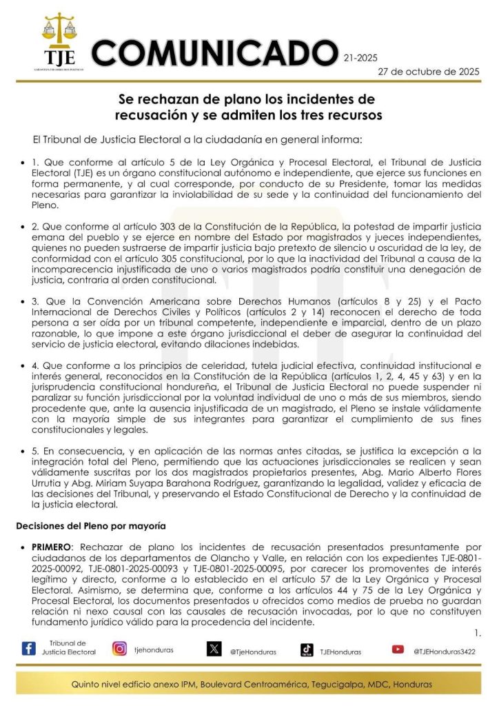 El Tribunal de Justicia Electora (TJE) rechazó este lunes los incidentes de recusación presentados en relación a la inscripción de los candidatos a diputados por el departamento de Valle y Olancho, «por carecer de carecer promoventes de interés electoral.