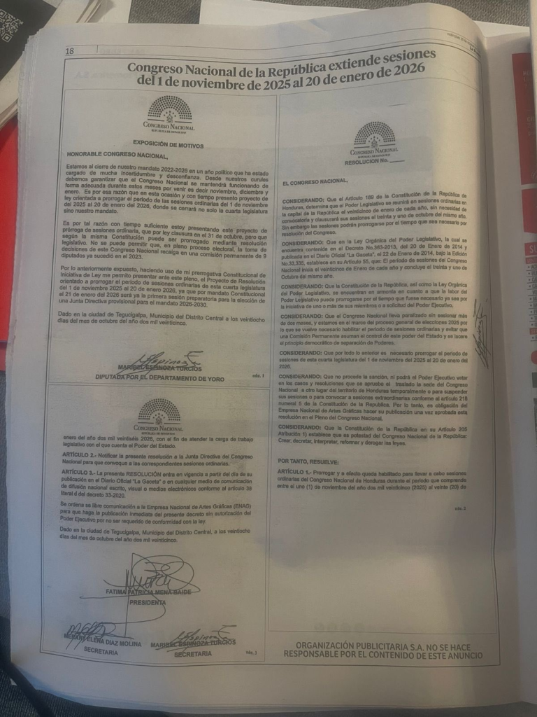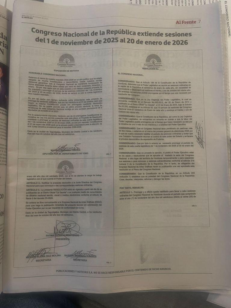 La extensión de sesiones del 1 de noviembre al 20 de enero de 2026, aprobada en sesión extraordinaria por partidos opositores fue publicada este viernes en varios medios de prensa escrita nacional.