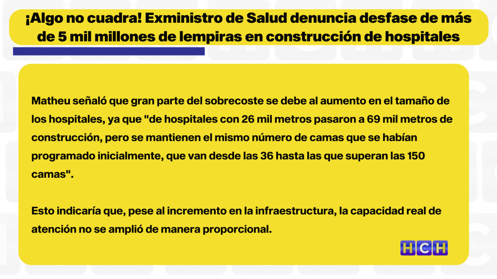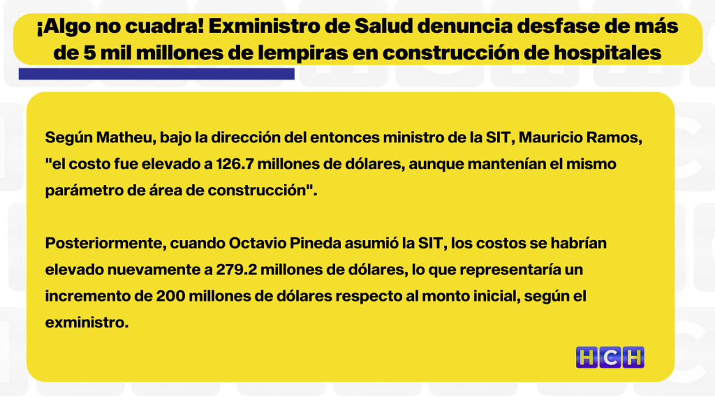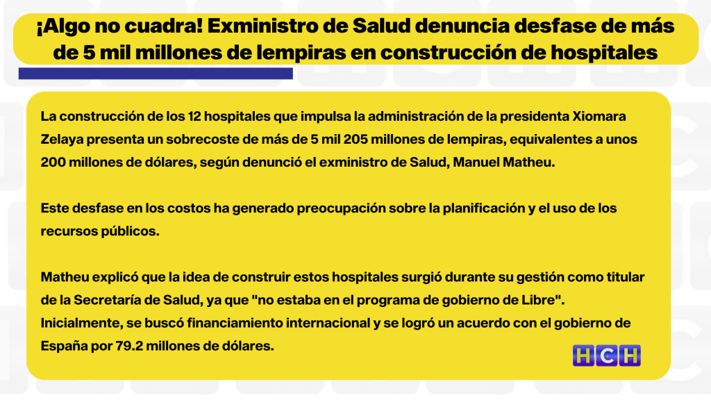 La construcción de los 12 hospitales que impulsa la administración de la presidenta Xiomara Zelaya presenta un sobrecoste de más de 5 mil 205 millones de lempiras, equivalentes a unos 200 millones de dólares, según denunció el exministro de Salud, José Manuel Matheu.