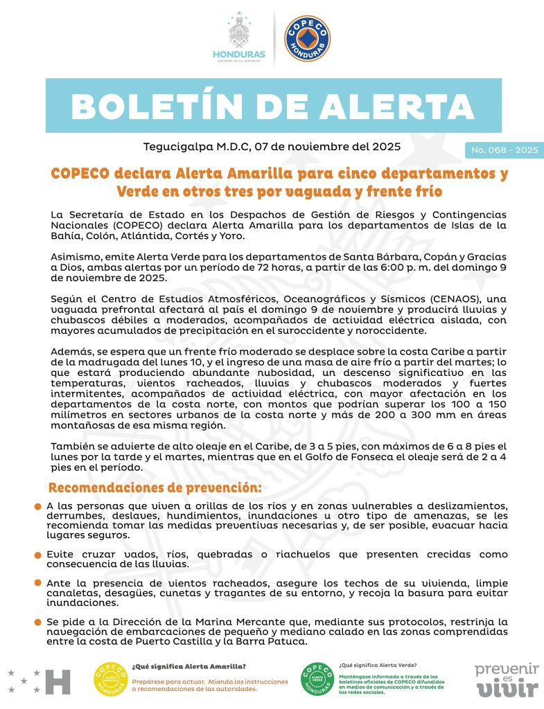 La Secretaría de Estado en los Despachos de Gestión de Riesgos y Contingencias Nacionales (COPECO) declaró alerta amarilla en los departamentos de Islas de la Bahía, Colón, Atlántida, Cortés y Yoro por el ingreso de una vaguada y frente frío al territorio nacional.