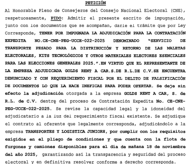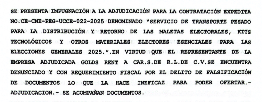 Según la denuncia presentada, el representante de Gold Rent A Car enfrenta acusaciones por falsificación, lo que, según los impugnantes, comprometería la transparencia y legalidad del proceso de contratación.