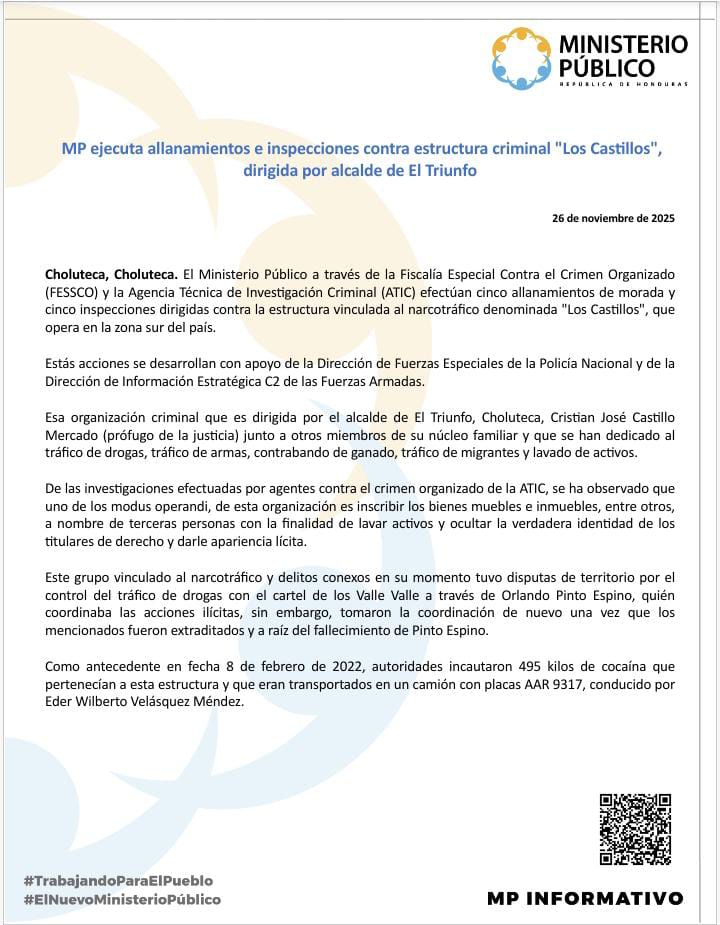 Esta estructura, según las investigaciones, ha mantenido una presencia sostenida en municipios de Choluteca y continúa operando pese a que su presunto líder, el alcalde de El Triunfo, Cristian José Castillo Mercado, se encuentra prófugo.