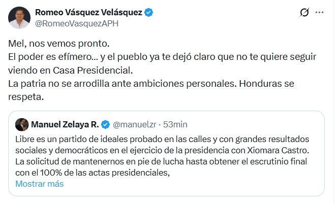 El Ex Jefe de las Fuerzas Armadas Honduras y actual prófugo de la justicia hondureña, Romeo Vásquez Velásquez, envió un mensaje al expresidente Manuel Zelaya Rosales, luego que resultados preliminares de el Consejo Nacional Electora (CNE) dejaran a su candidata Rixi Moncada en tercer lugar.