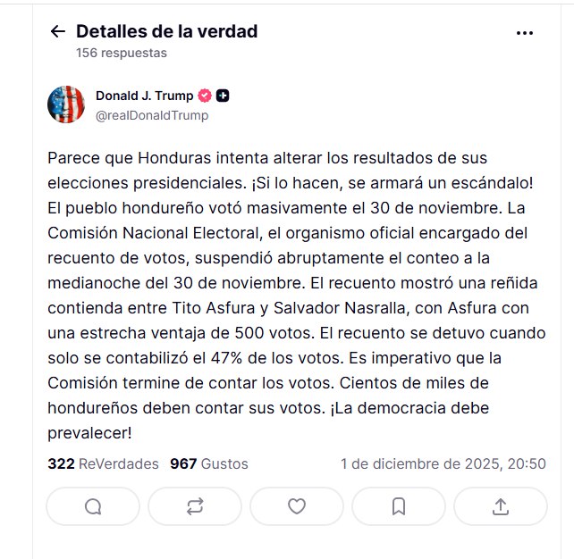 El presidente de los Estados Unidos, Donald Trump, se refirió a los resultados del proceso electoral en Honduras, advirtiendo que si alteran los resultados de las elecciones «se armará un escandalo».