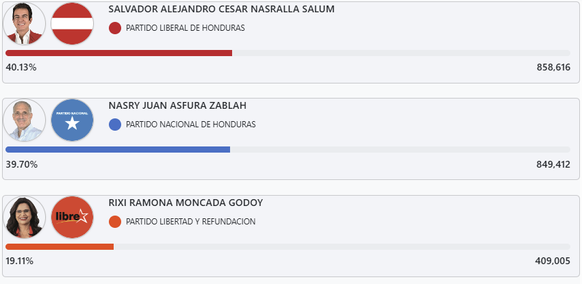 Por su parte, Moncada, quien buscaba la presidencia de la República se posiciona en el tercer lugar con 409,005 votos, por debajo de Nasry Asfura (849,412) y Salvador Nasralla (858,616).