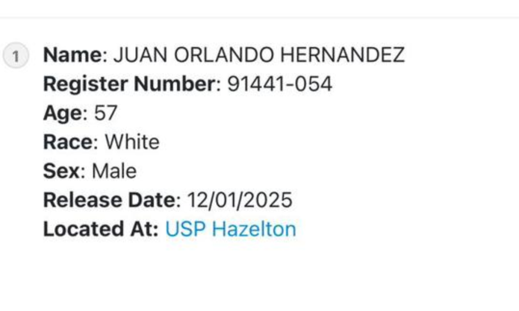 El sitio oficial del Federal Bureau of Prisons (BOP) indica este martes que el expresidente hondureño Juan Orlando Hernández, con registro 91441‑054, aparece con fecha de liberación para el 1 de diciembre de 2025, ubicado actualmente en la prisión USP Hazelton. La información ha sido verificada directamente en la base de datos pública del BOP, aunque el historial del exmandatario y la naturaleza de su proceso generan gran incertidumbre sobre la interpretación de estos datos.