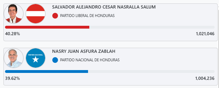 Con la última actualización del Consejo Nacional Electoral (CNE), a las 10:51 a.m. de la mañana de este miércoles, la distancia entre Salvador Nasralla y Nasry Asfura se acorta levemente a 16,810 votos, manteniendo el candidato liberal 1,021,046 votos contra los 1.004,2366 de su contrincante nacionalista