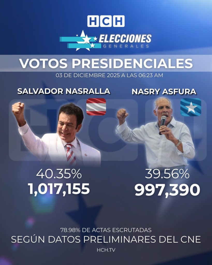 Luego de la última actualización del Consejo Nacional Electoral (CNE), a las 6:23 de la mañana de este miércoles, la distancia entre Salvador Nasralla y Nasry Asfura se acorta levemente a 19,765 votos, manteniendo el candidato liberal 1,016,582 votos contra los 996,777 de su contrincante nacionalista