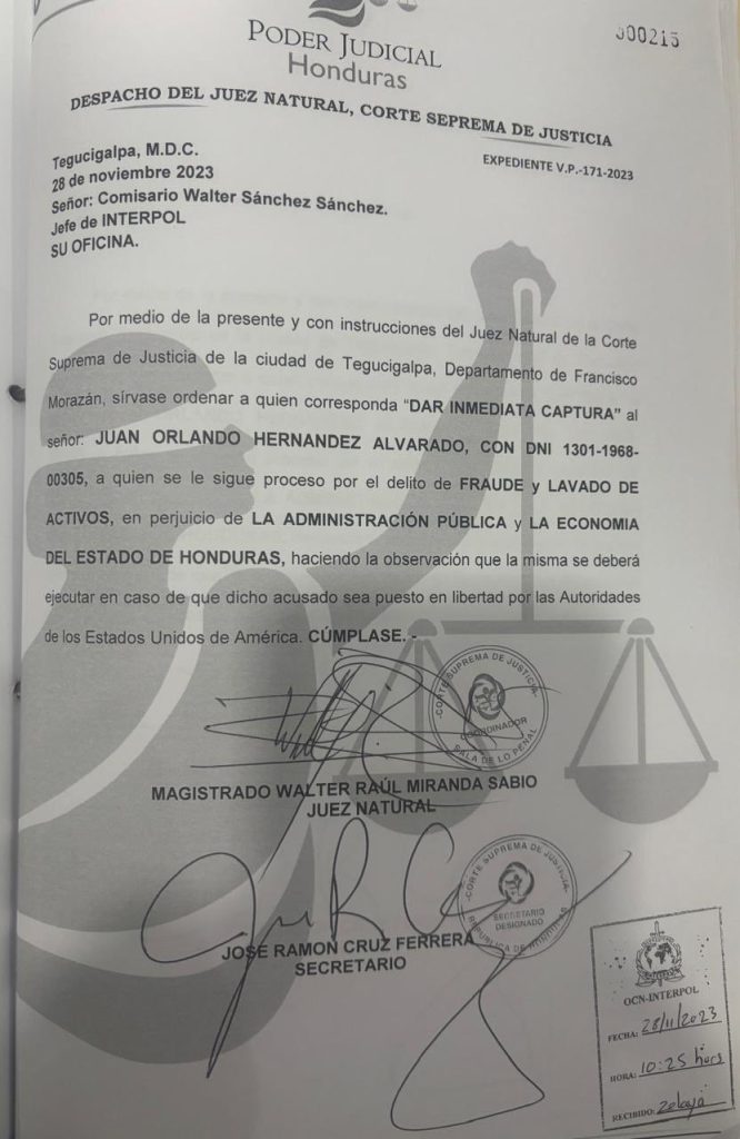 «En el marco del Día Internacional Contra la Corrupción que se conmemora mañana 9 de diciembre, informo al pueblo hondureño que he instruido a la ATIC y también exhorto a los organismos de seguridad del Estado y a nuestros aliados internacionales, como ser la INTERPOL, a ejecutar la orden de captura internacional contra el expresidente Juan Orlando Hernández, acusado por los delitos de lavado de activos y fraude en el caso Pandora II. Nuestra lucha es frontal», informó el fiscal a través de sus redes sociales.