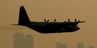 Un gigantesco avión de transporte militar sobrevuela cabezas a pocos metros...